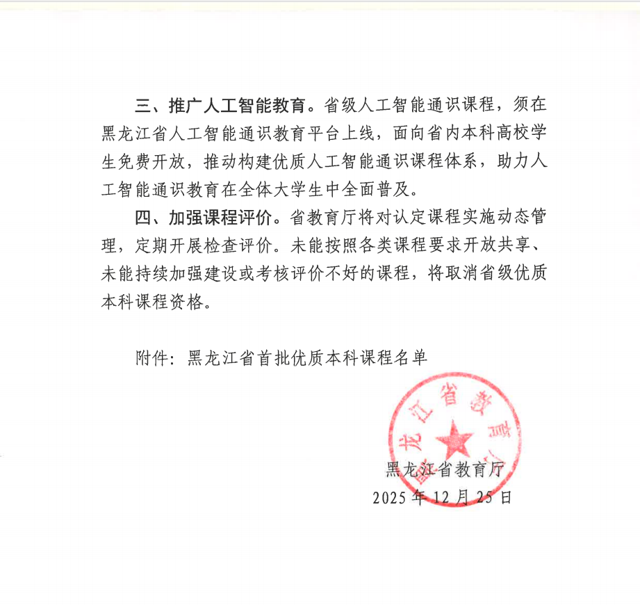 12月25日,黑龍江省教育廳公布了首批優(yōu)質(zhì)本科課程認(rèn)定結(jié)果,我?!妒秤镁S化生產(chǎn)與管理》和《人工智能通識課程》兩門課程成功入選。