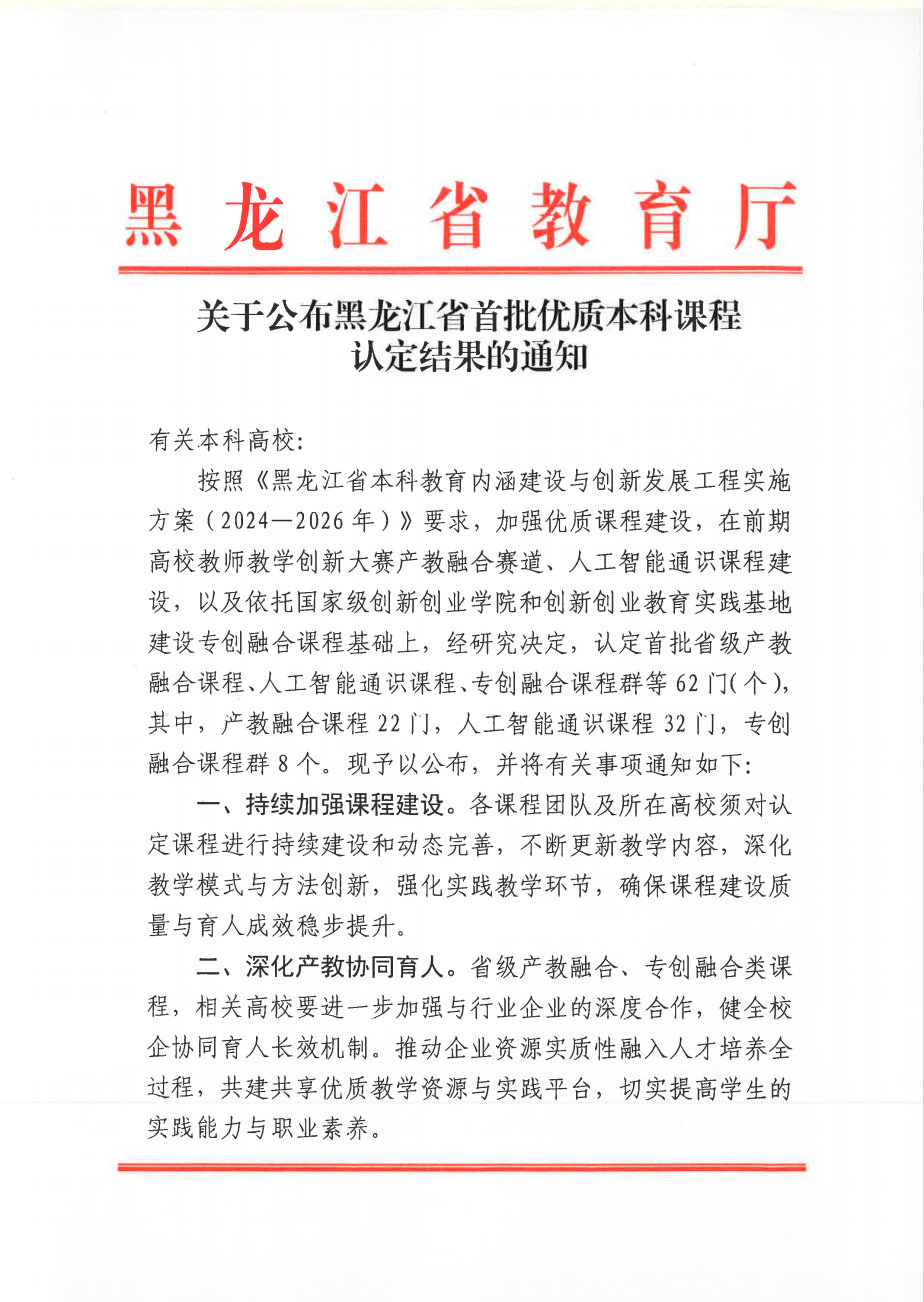 此次獲批省級優(yōu)質(zhì)本科課程,是我校落實(shí)《黑龍江省本科教育內(nèi)涵建設(shè)與創(chuàng)新發(fā)展工程實(shí)施方案(2024—2026年)》的重要階段性成果,體現(xiàn)了學(xué)校在課程建設(shè)與教學(xué)質(zhì)量提升方面的持續(xù)努力。近年來,學(xué)校高度重視本科教育內(nèi)涵發(fā)展,系統(tǒng)推進(jìn)課程改革與創(chuàng)新,著力打造具有高階性、創(chuàng)新性與挑戰(zhàn)度的一流課程。