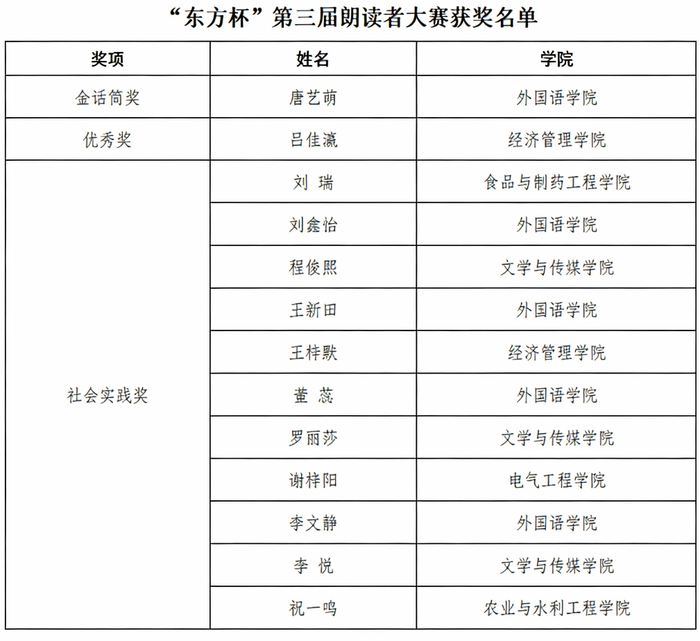 近日,由中共黑龍江省委宣傳部、黑龍江省教育廳、共青團黑龍江省委員會、黑龍江省關(guān)心下一代工作委員會聯(lián)合主辦的黑龍江省“東方杯”第三屆朗讀者大賽圓滿落幕。我校1人獲金話筒獎,1人獲優(yōu)秀獎,1人獲優(yōu)秀指導(dǎo)教師獎,11人獲社會實踐獎。