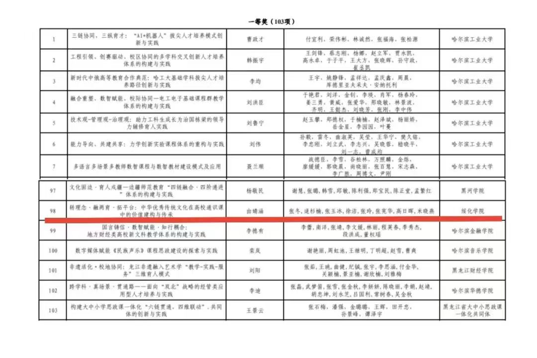 近日,黑龍江省教育廳公布了2025年黑龍江省高等教育教學成果獎獲獎名單。我校教師由婧涵主持完成的《轉理念·融兩育·拓平臺:中華優(yōu)秀傳統(tǒng)文化在高校通識課中的價值建構與傳承》榮獲省級教學成果一等獎;張秀艷主持完成的《“三進鑄魂,四課聯(lián)動,五技提升”:外語類課程“三進”模式探索與實踐》榮獲省級教學成果二等獎。